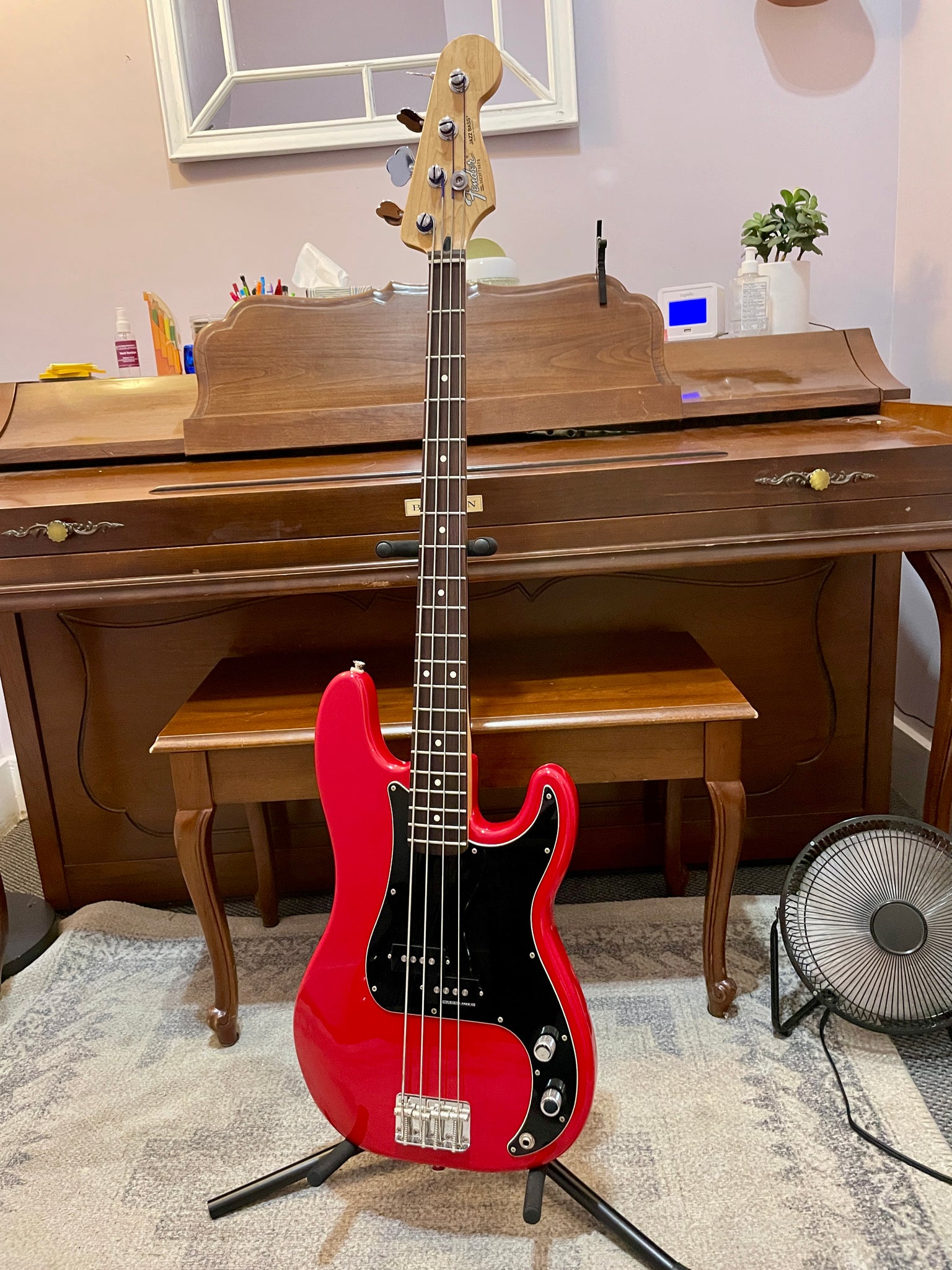 A great bass for all professional players out there! This Fender bass combines the great, versatile tone of a Precision Bass with the easy playability of a Jazz Bass. It has a swapped MIM J-bass neck and an upgraded Bass Line Quarter Pounder pickup. It plays well up the neck and sounds great!